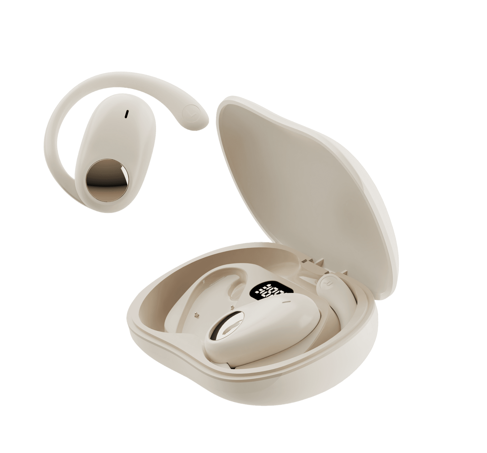 Versão Bluetooth: 5.4 Distância de transmissão: até 10 metros Tempo de reprodução/conversação: até 5 horas Tempo de espera: até 120 horas Com estação de carregamento reserva de 250mAh Com display LCD Com gancho de orelha mais confortável e ajustável Cor: bege Compatível com iOS e Android